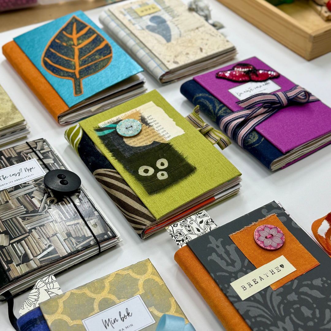 En helt unik anteckningsbok av återvunnet & återfunnet material som gamla kuvert, brev, böcker, tygbitar, snören, tapetprover, smycken och annat, valt med hjärtat och omvandlat till något nytt, vackert och meningsfullt.