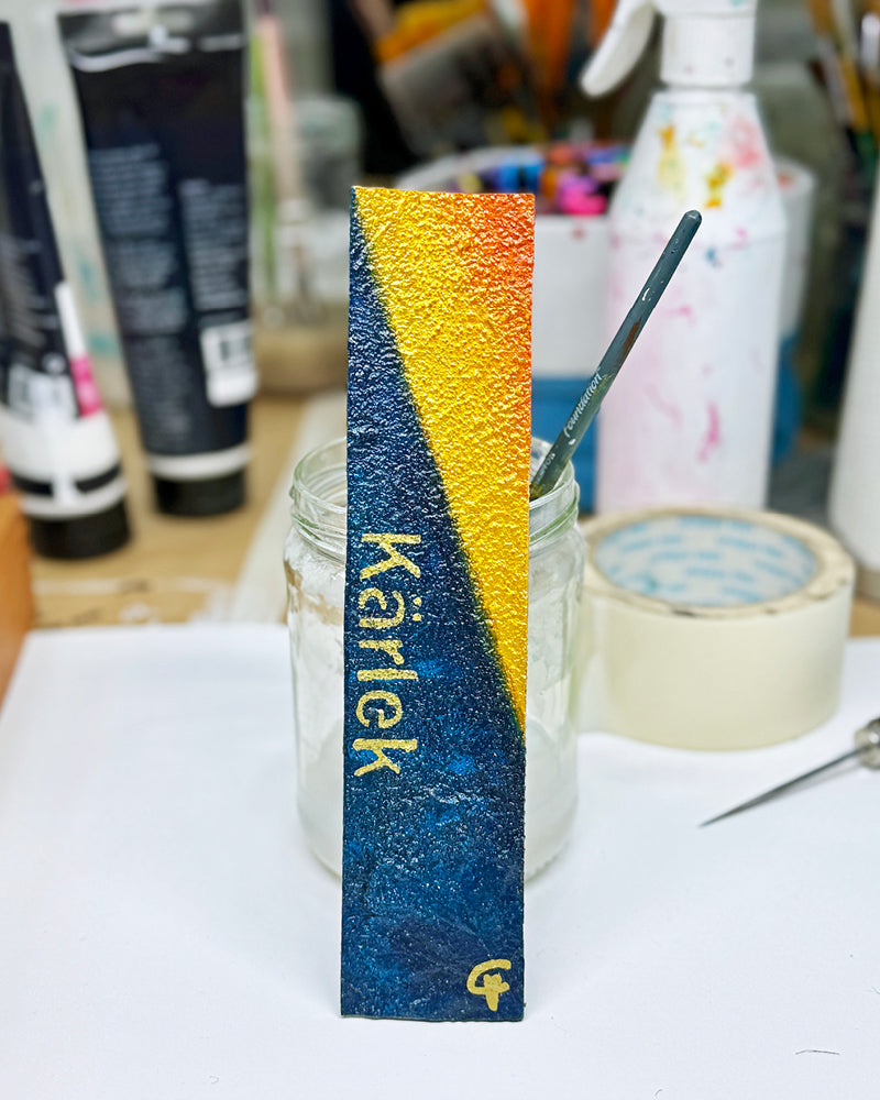 Ett litet konstverk i bokmärkesform. Det här bokmärket är skapat av överblivna bitar canvas från min ateljé, handmålat och dekorerat med akrylfärg. Varje bokmärke är helt unikt och bär spår av det större skapandet – små fragment av målningar, nyanser och energi.